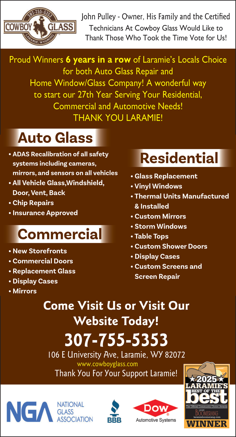 Oct 11, 2025. Cowboy Glass LLC Auto Service Ads from Laramie Boomerang