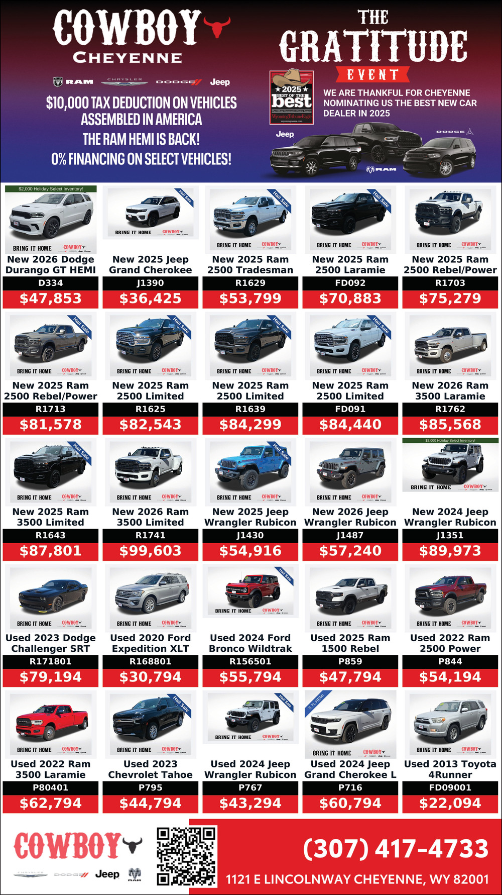 Dec 06, 2025. Cowboy Cheyenne Auto Dealers Ads from Laramie Boomerang