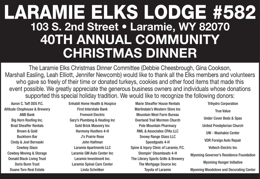 Jan 10, 2026. Laramie Elks Lodge #582 Events Ads from Laramie Boomerang