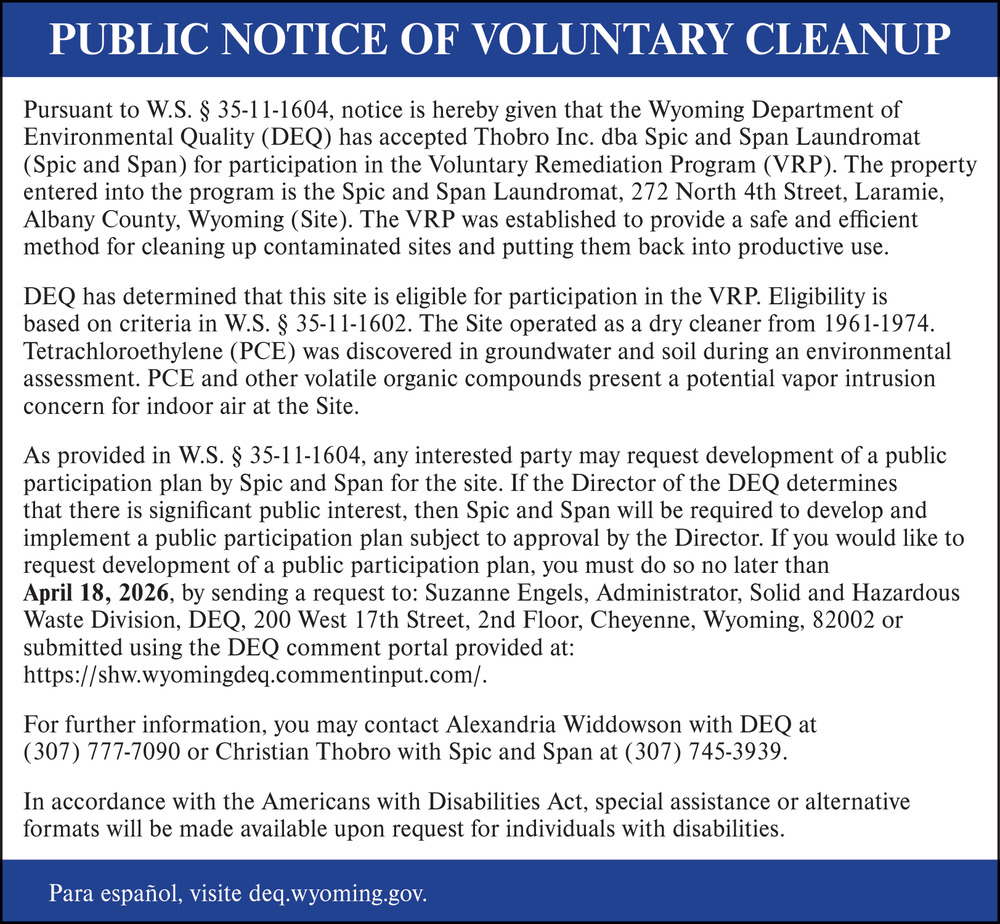 Feb 26, 2026. Wyoming Department of Environmental Quality Government Ads from Laramie Boomerang