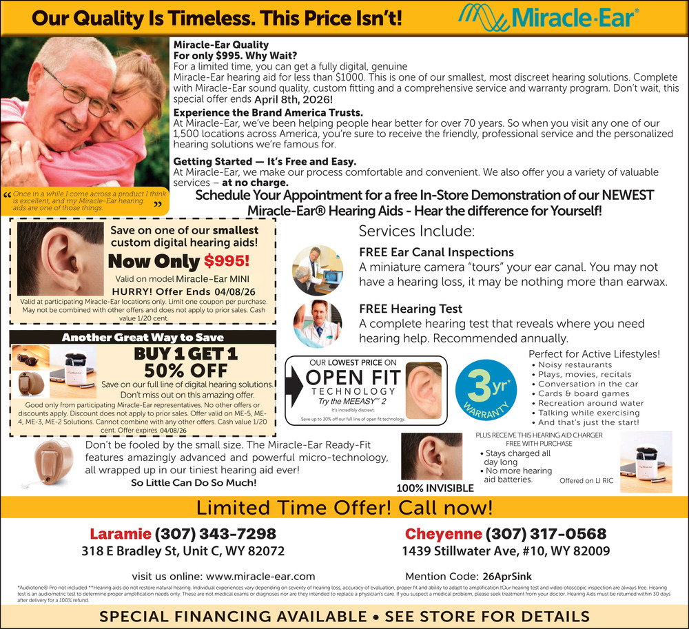 Apr 02, 2026. Miracle-Ear Hearing Centers Health & Wellness Ads from Laramie Boomerang